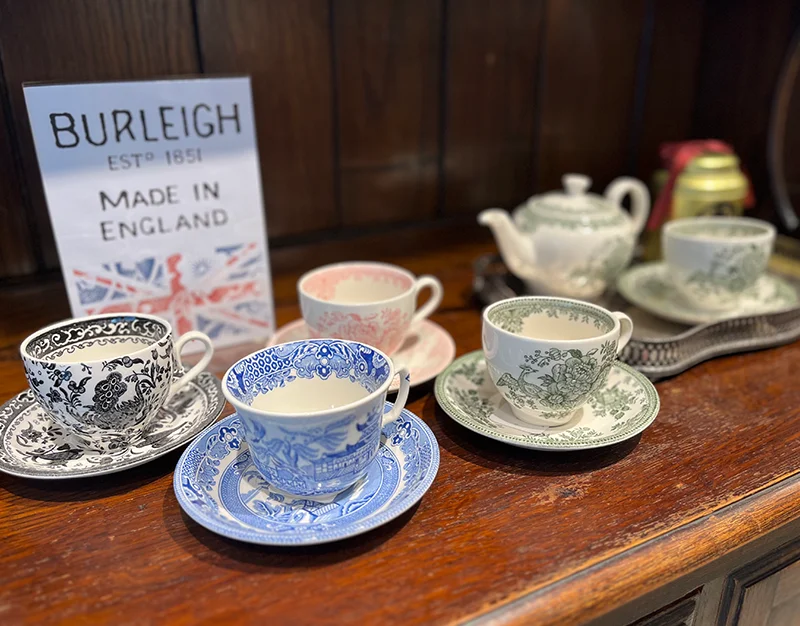 店名にも使われているブルーウィローパターン柄をはじめ、伝統的な愛らしいデザインの食器で紅茶を提供いたします。