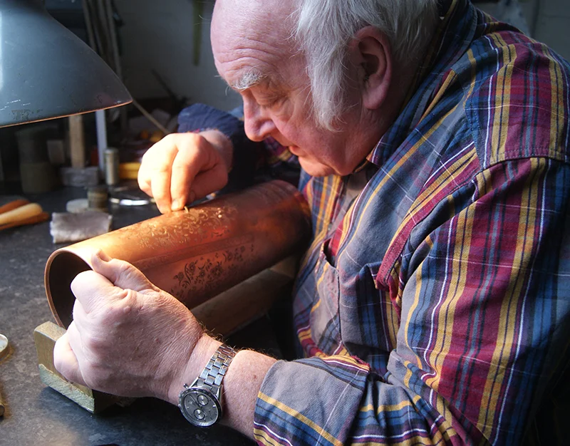 銅板に手彫りで柄を刻みインクを乗せ、薄紙にプリントしたものを陶器に転写して柄を焼き付ける製法です。