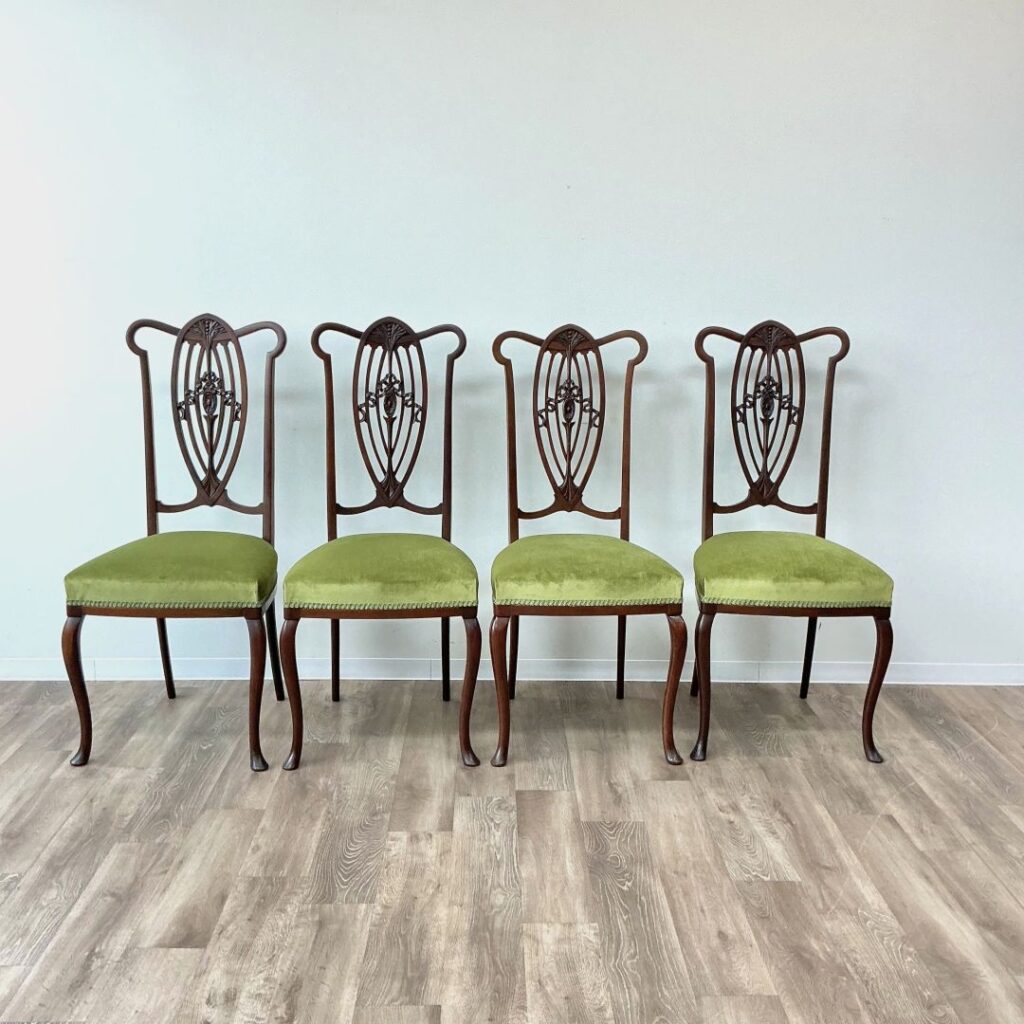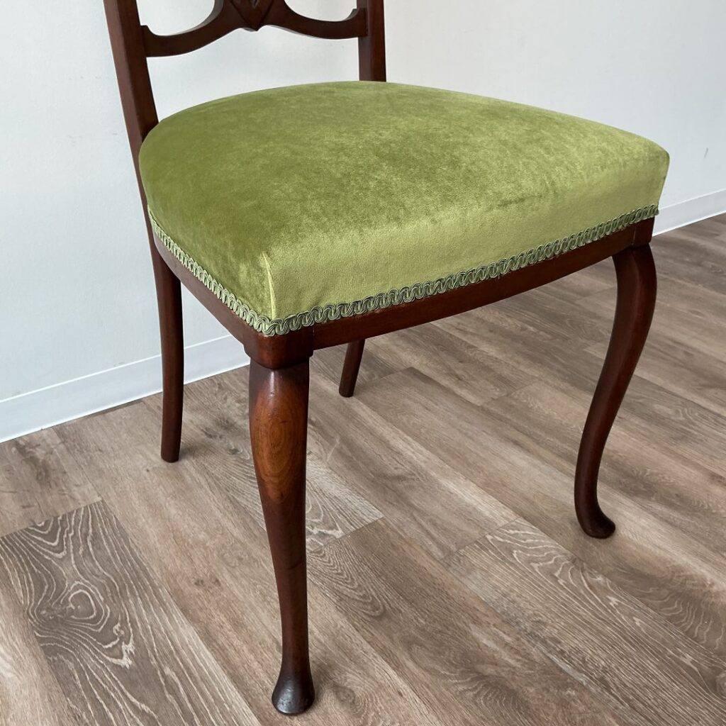 座面は古艶をまとった木部にマッチする少し光沢のあるグリーンの生地に張り替えました。