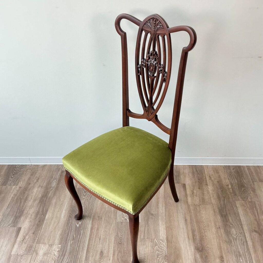 座面は古艶をまとった木部にマッチする少し光沢のあるグリーンの生地に張り替えました。