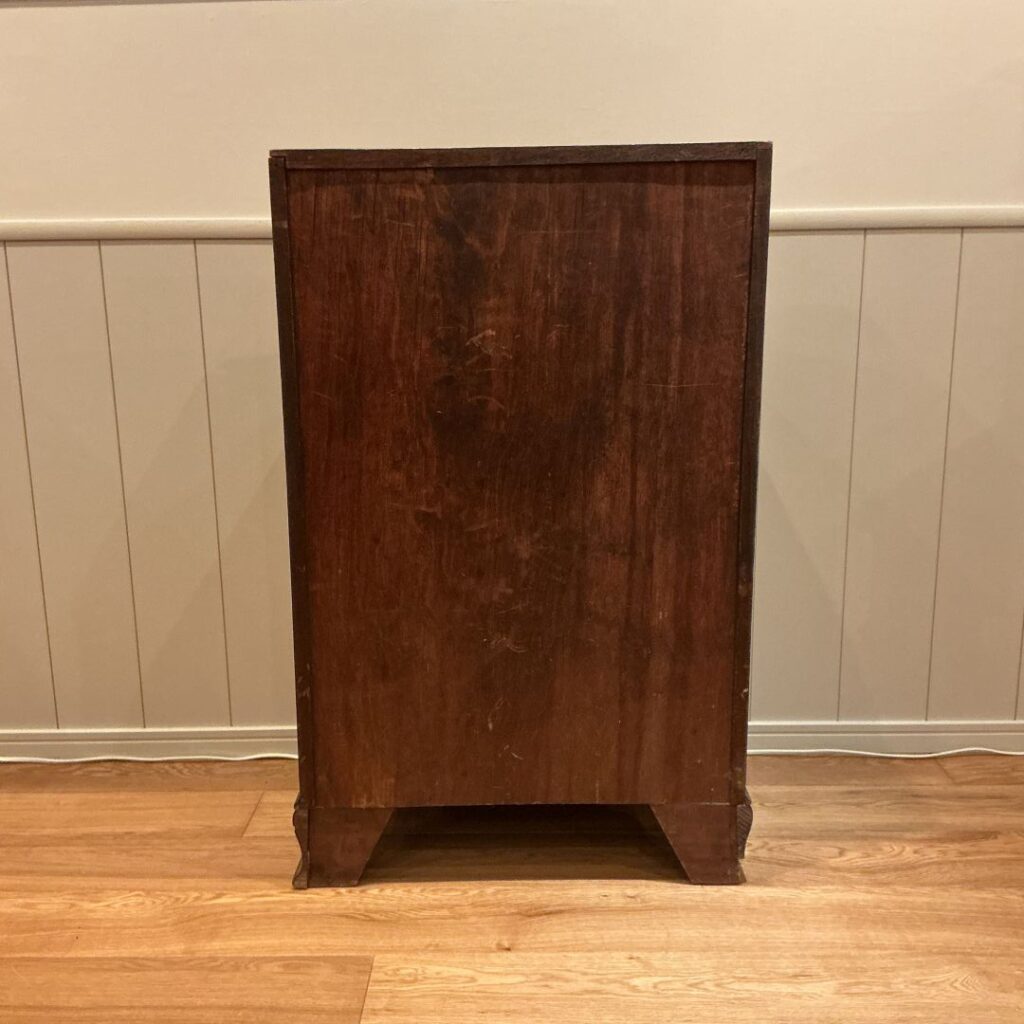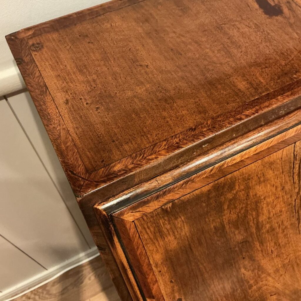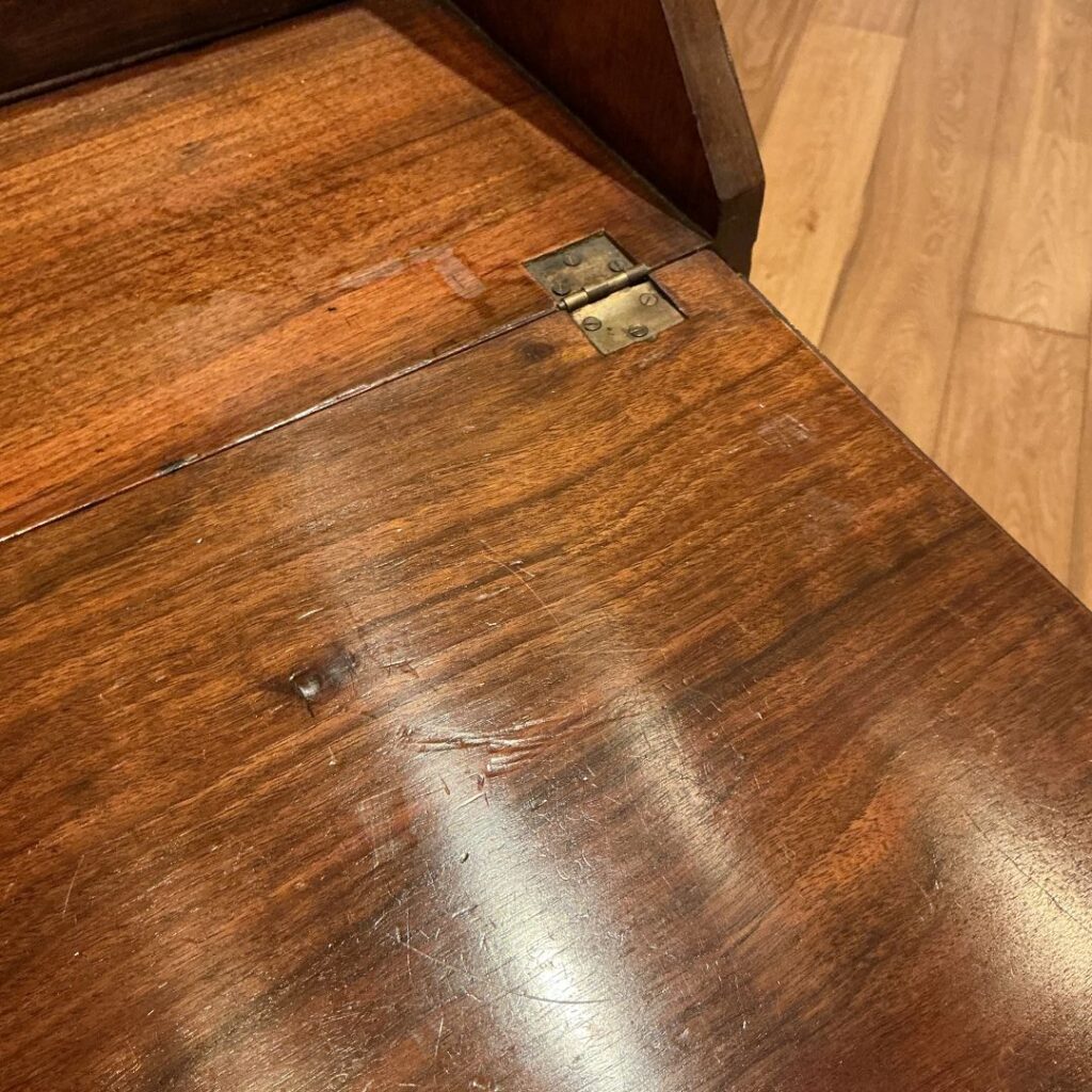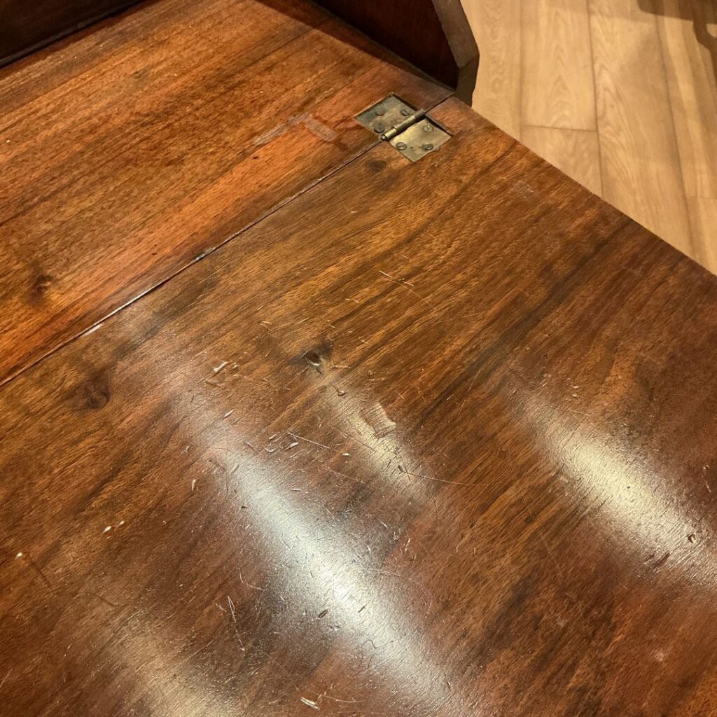 コンパクトなサイズですが、ジョージアンスタイルのパネルデザインで、天板を閉じた時のフラップ、引き出しの前面のウォルナット特有の杢目が素敵です。