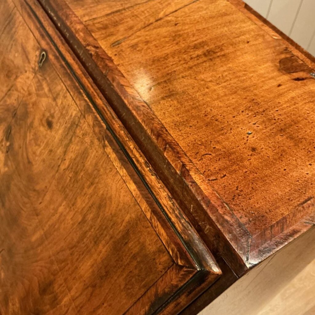コンパクトなサイズですが、ジョージアンスタイルのパネルデザインで、天板を閉じた時のフラップ、引き出しの前面のウォルナット特有の杢目が素敵です。