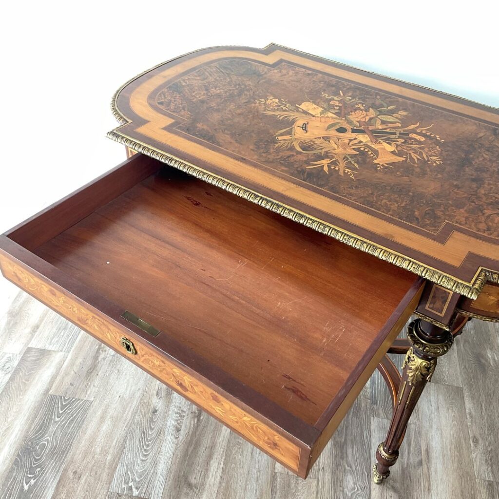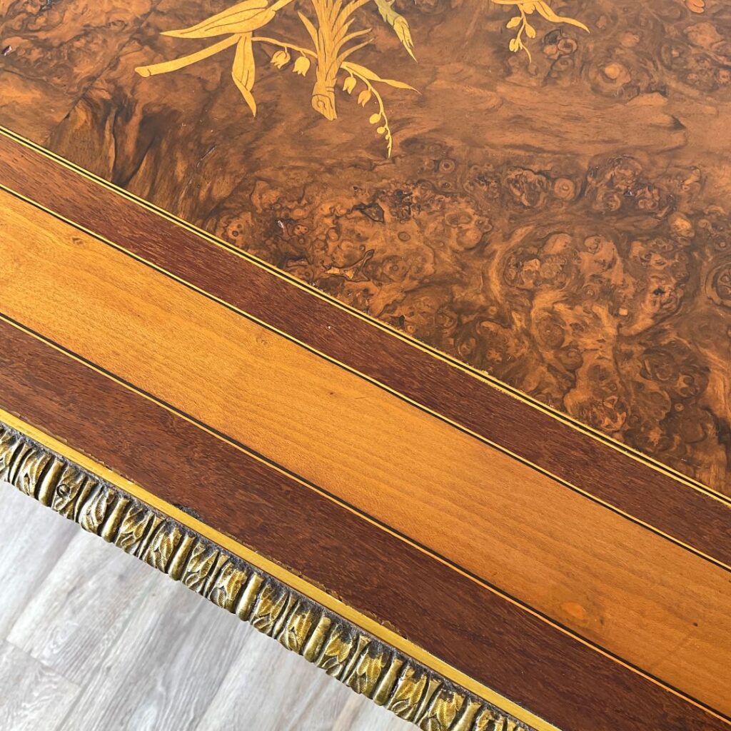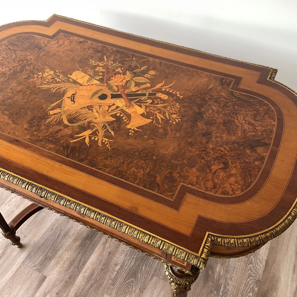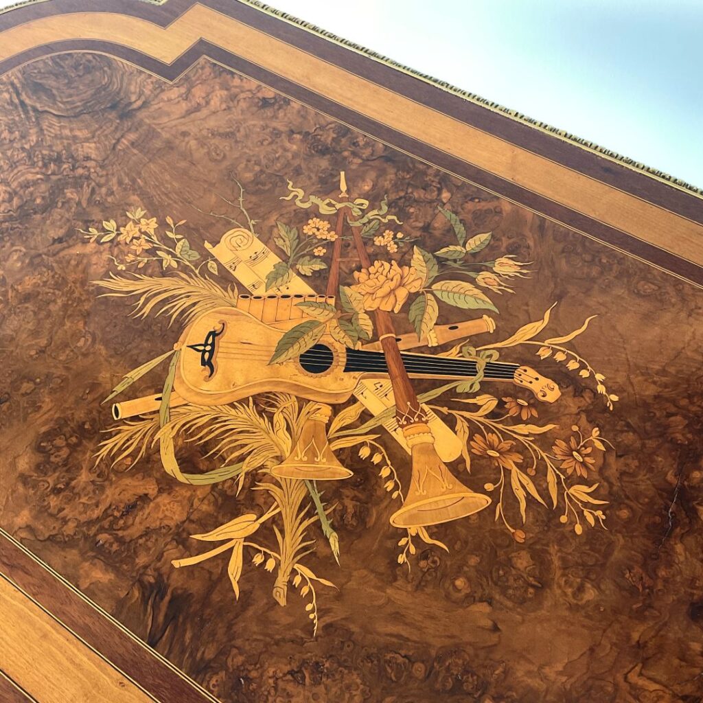 天板にはウォルナットの杢目に植物と楽器のマーケットーが華やかに飾られています。