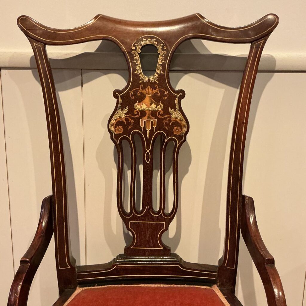 透かし彫りの背もたれに彩られたインレイが美しく気品のあるチェアです。