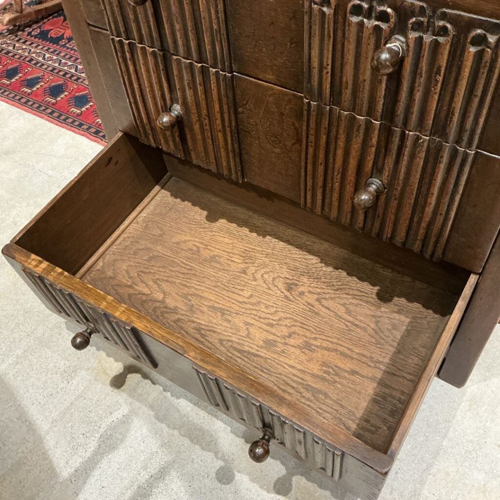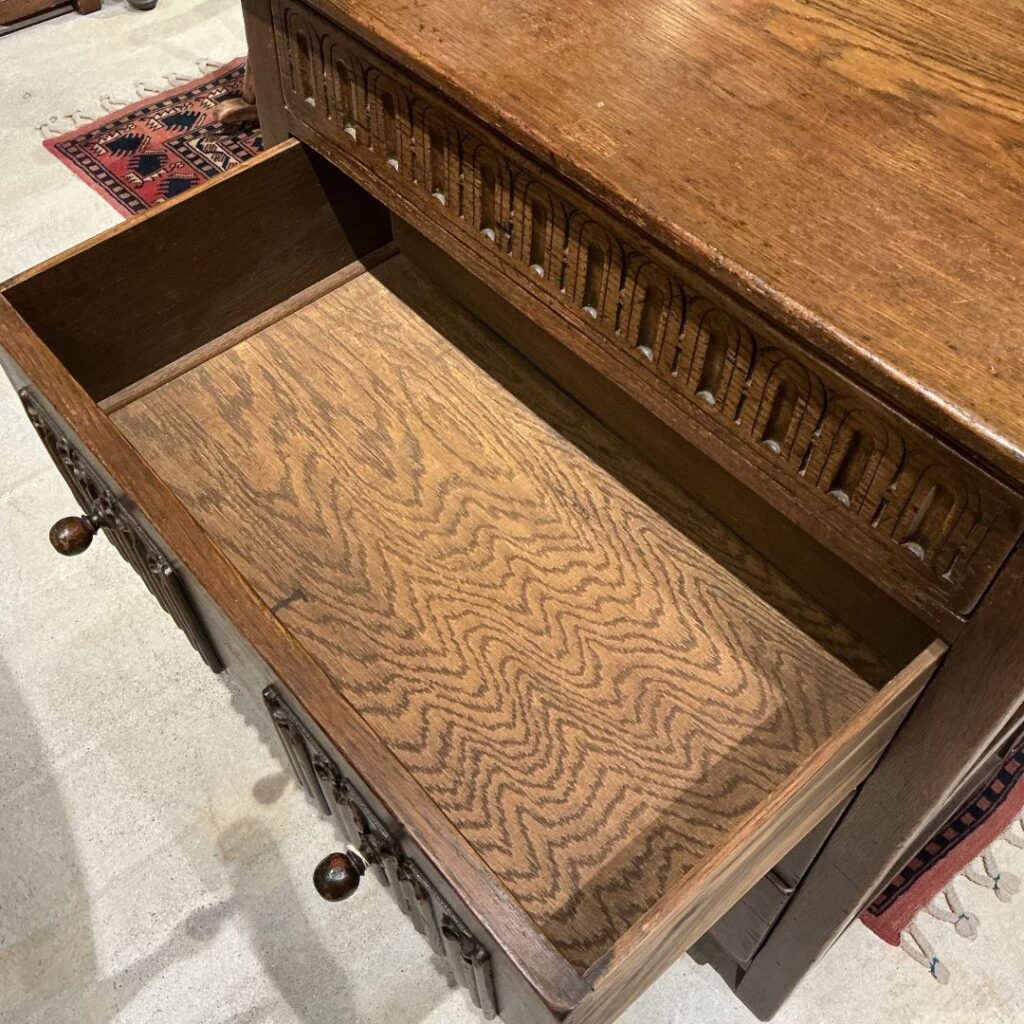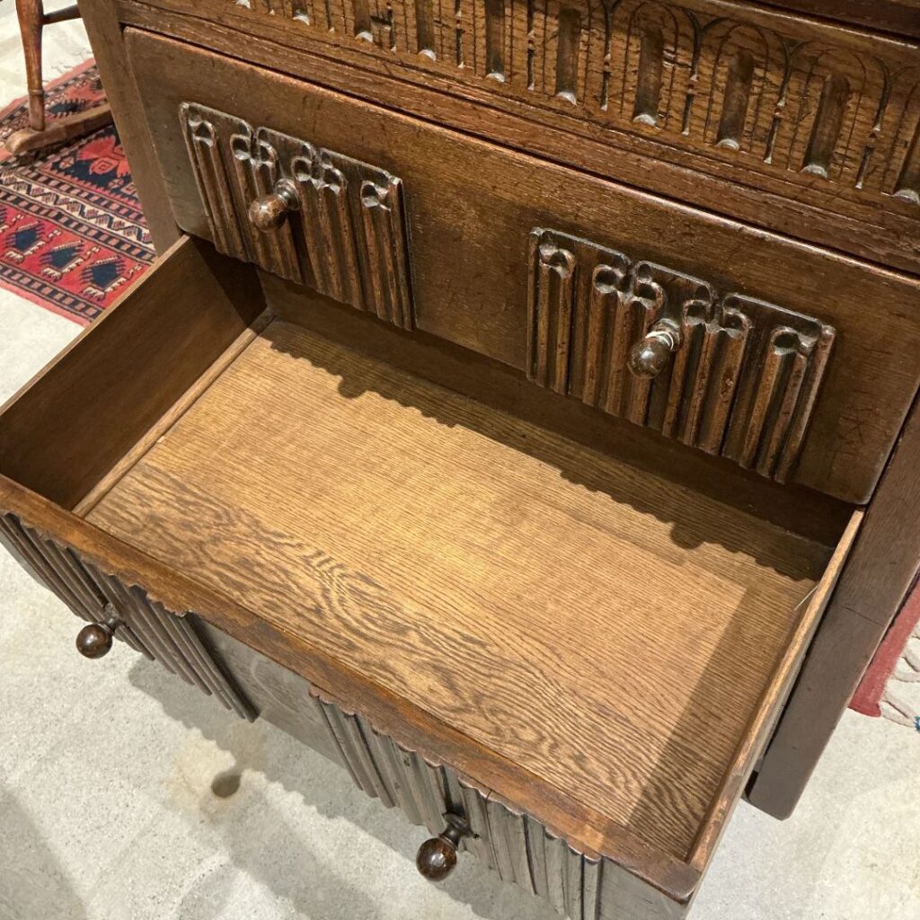 オーク特有の素朴な風合いが出ており、引き出しはリネンフォールドとよばれる、布がドレープ状に折り重なった