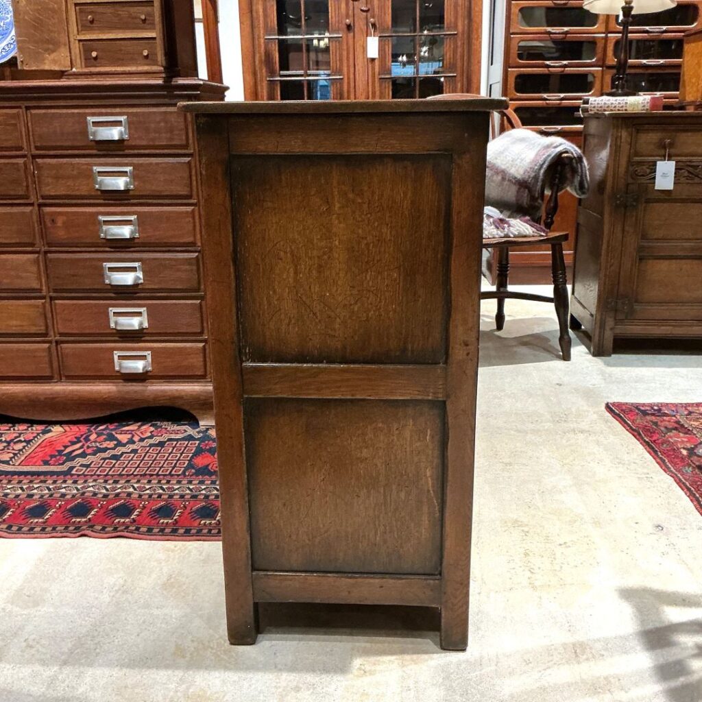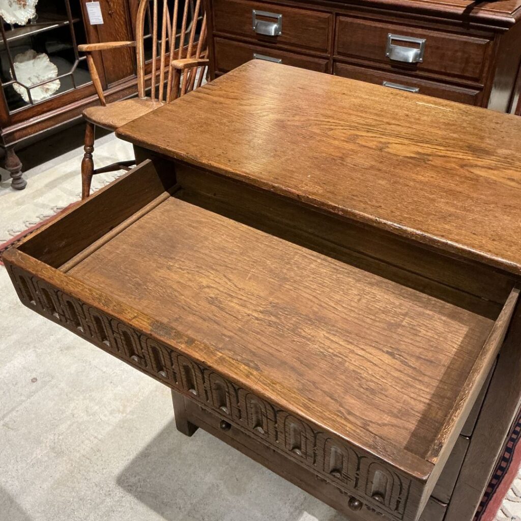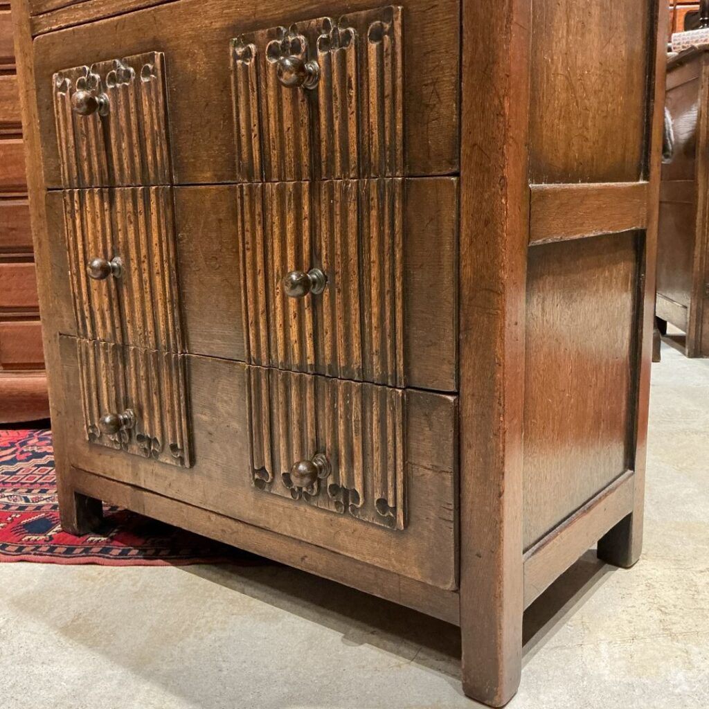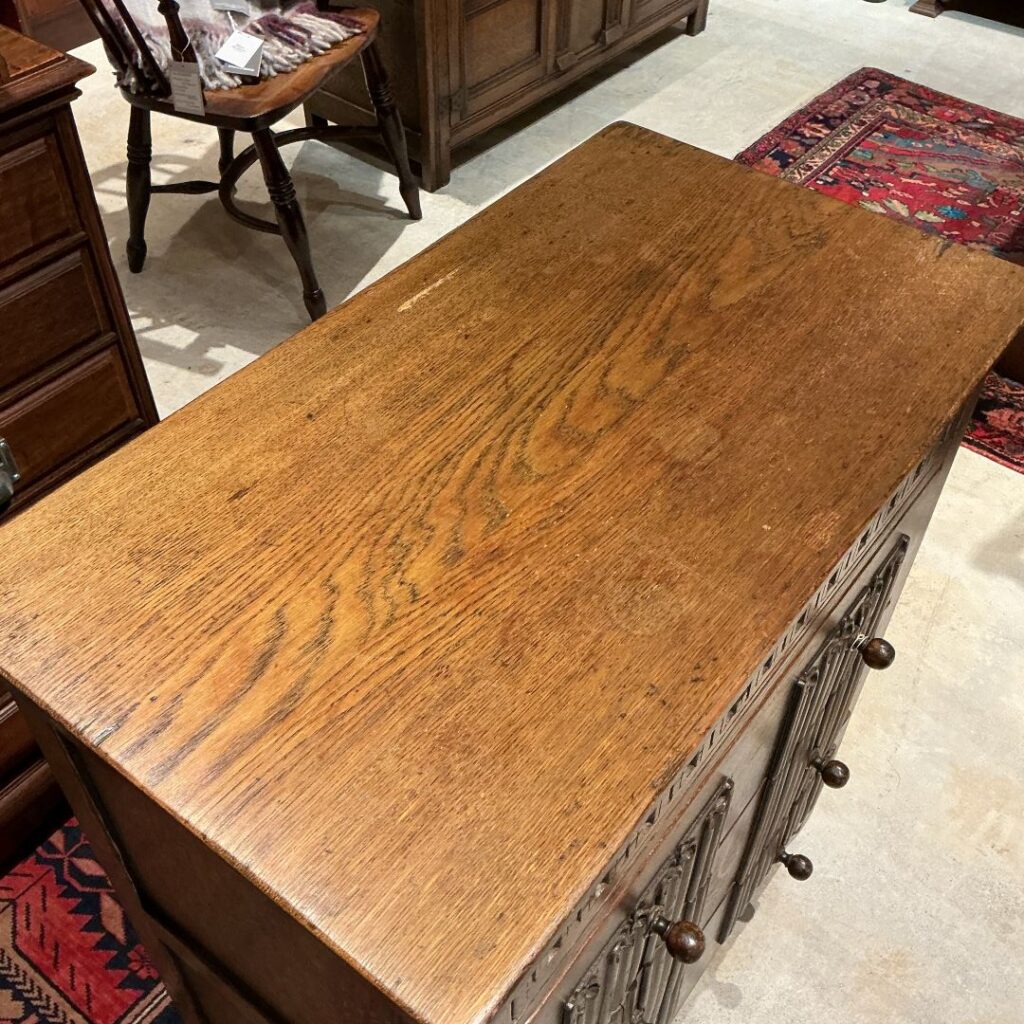 オーク特有の素朴な風合いが出ており、引き出しはリネンフォールドとよばれる、布がドレープ状に折り重なった