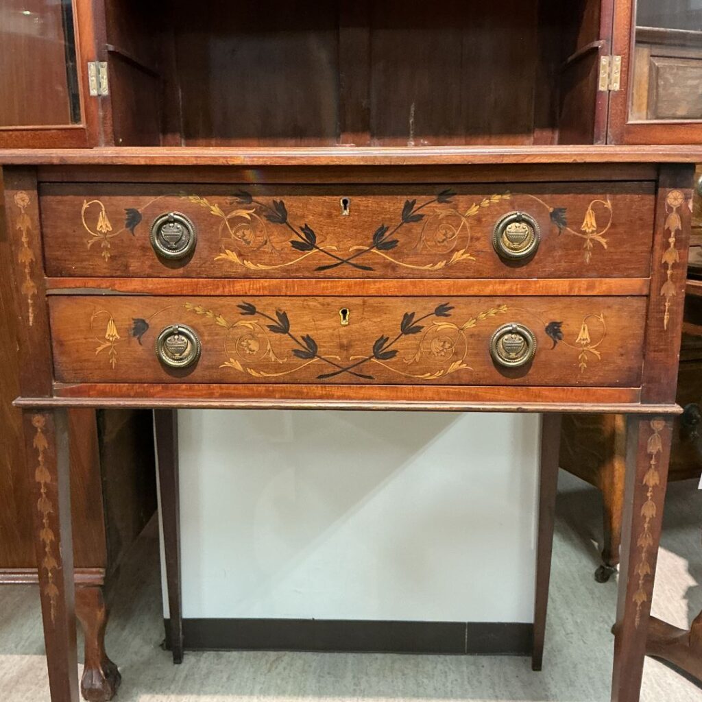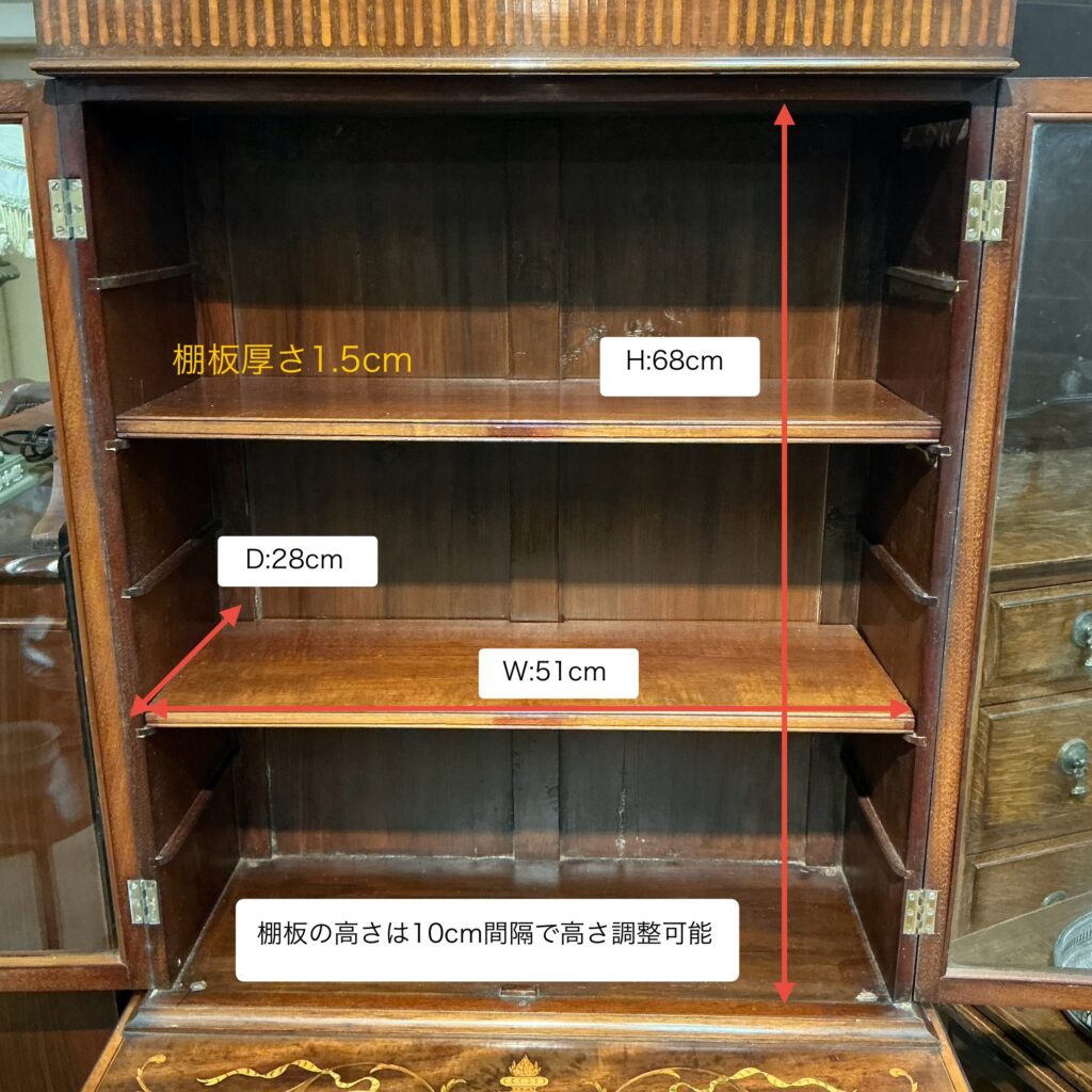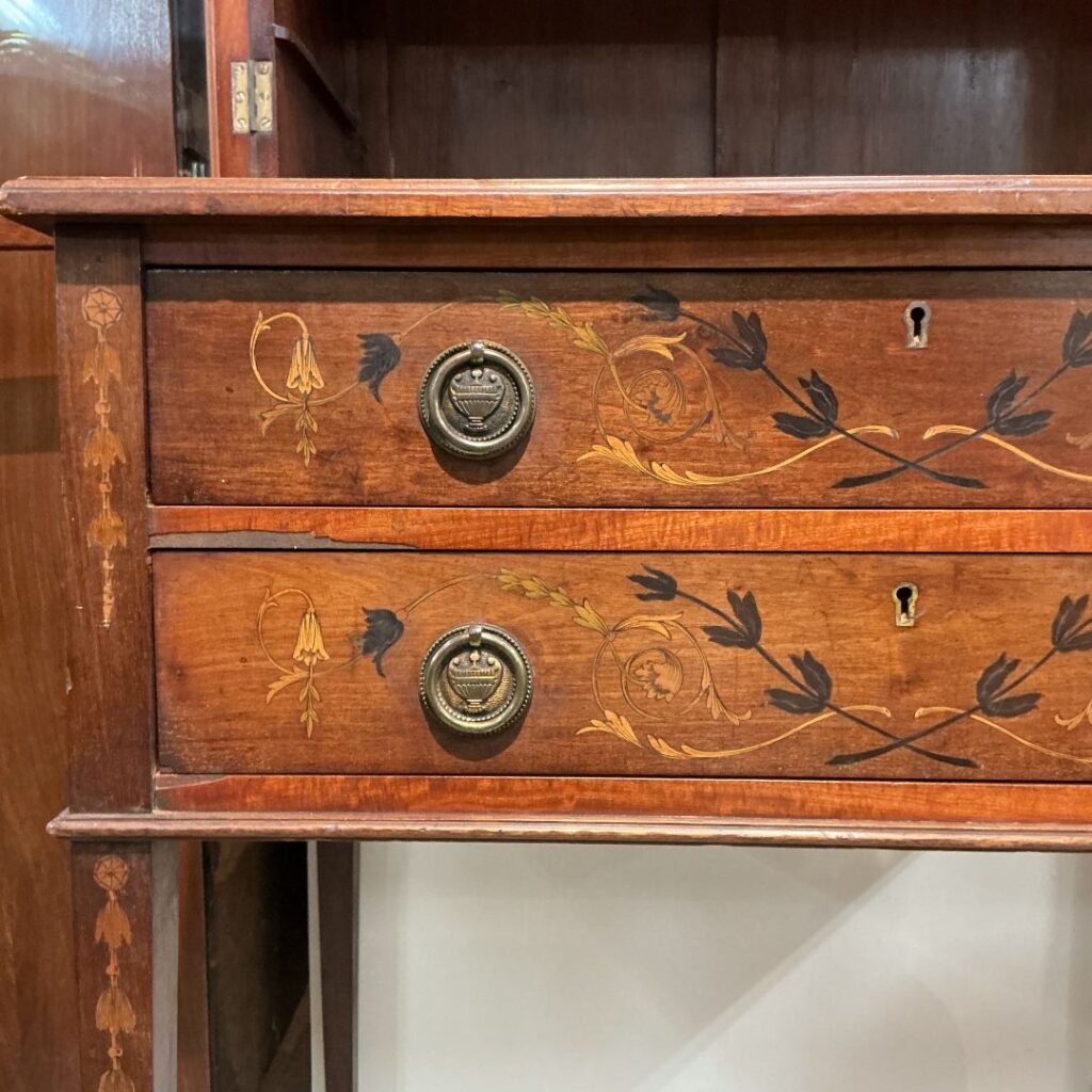 シンプルなプロポーションですが、全体にリボンや草花の蔦のモチーフのインレイが華やかに彩られており、トップの張り出した屋根の部分(コーニス)も非常に丁寧な製作技術で造られています。