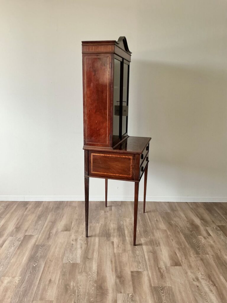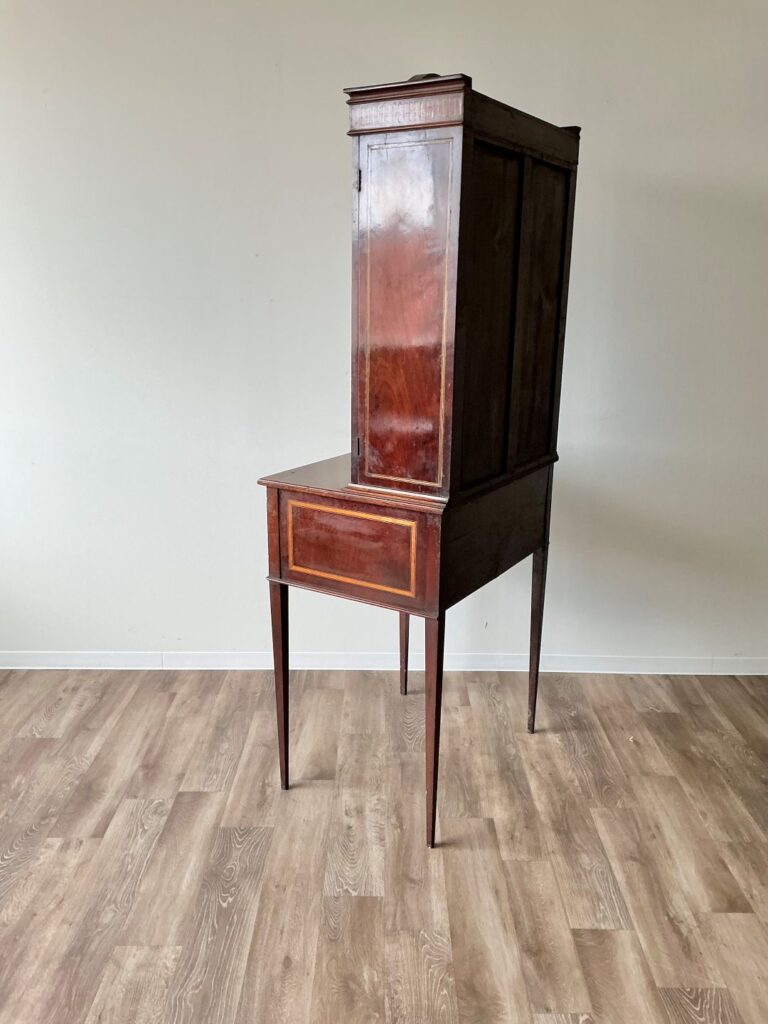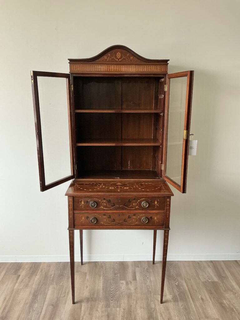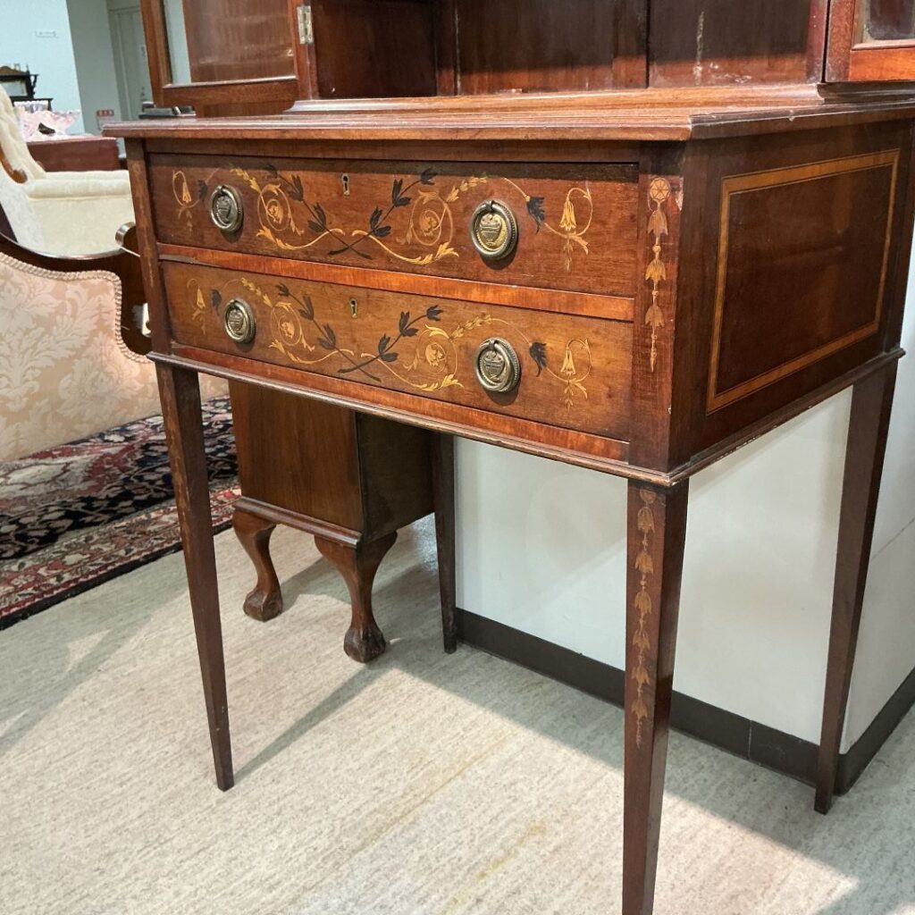 シンプルなプロポーションですが、全体にリボンや草花の蔦のモチーフのインレイが華やかに彩られており、トップの張り出した屋根の部分(コーニス)も非常に丁寧な製作技術で造られています。