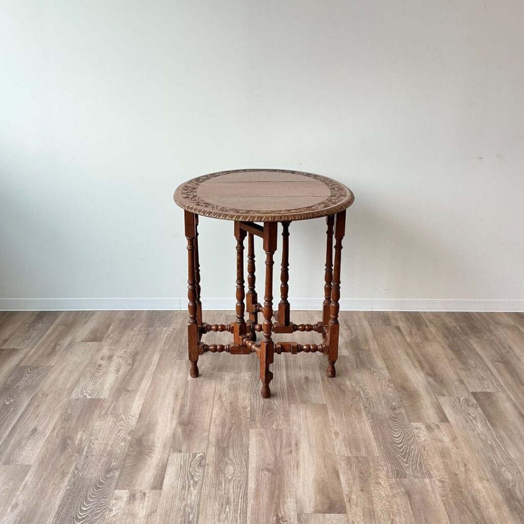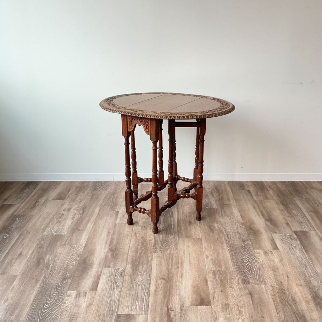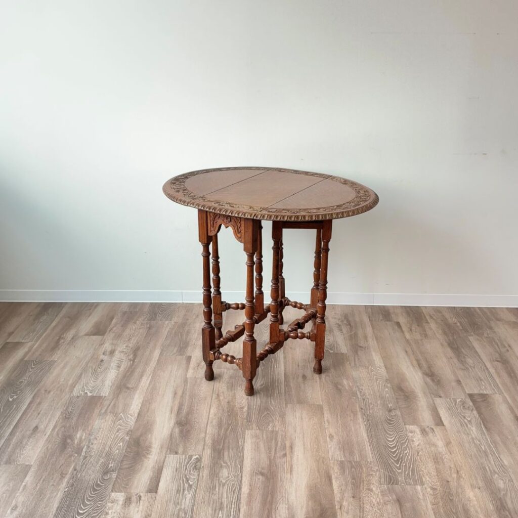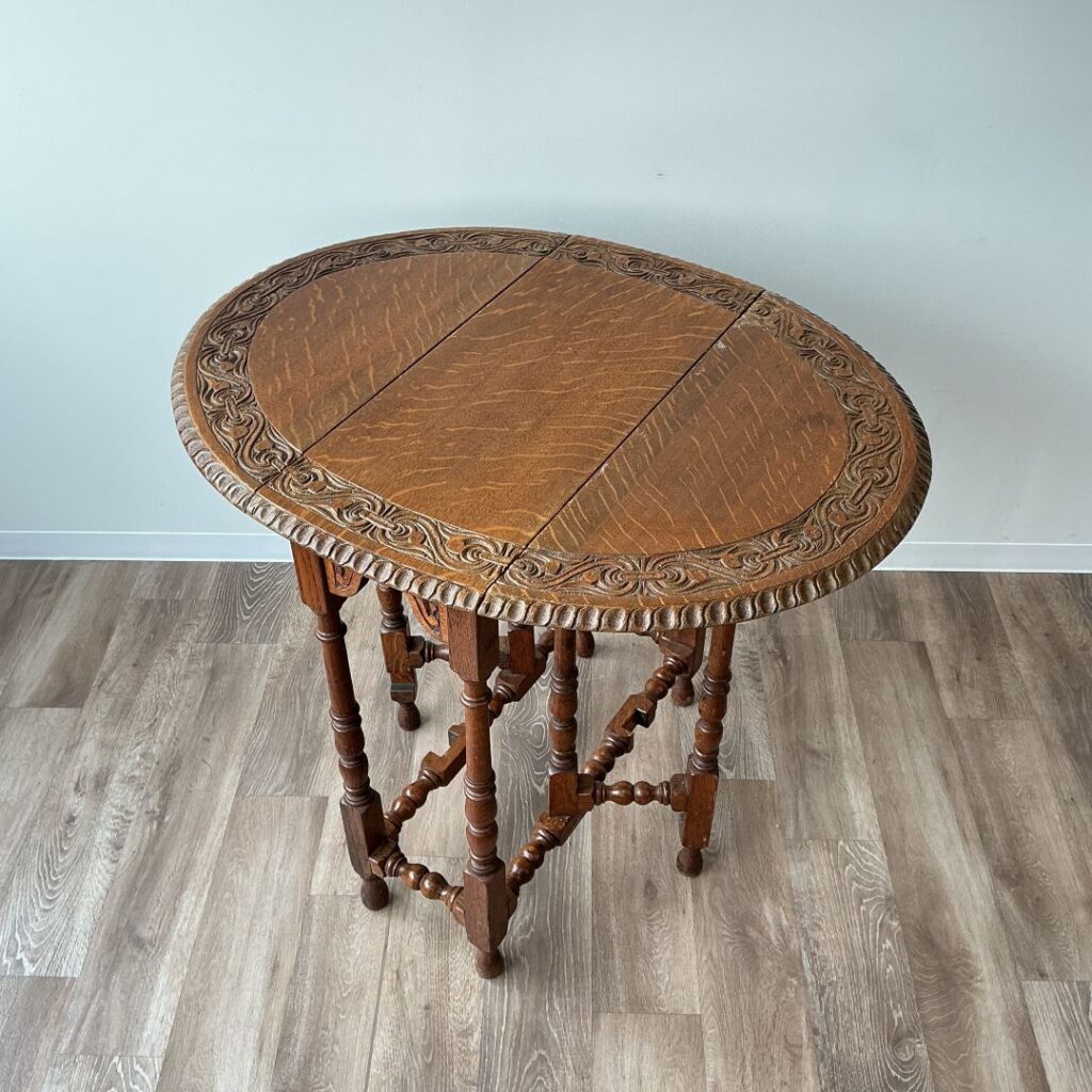 1920年代、オーク材のゲートレッグテーブル。天板縁の彫刻が特徴的です。