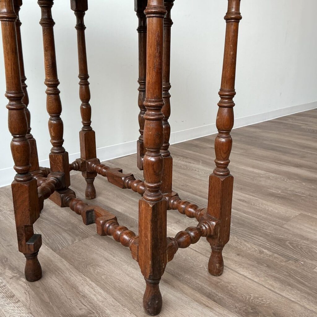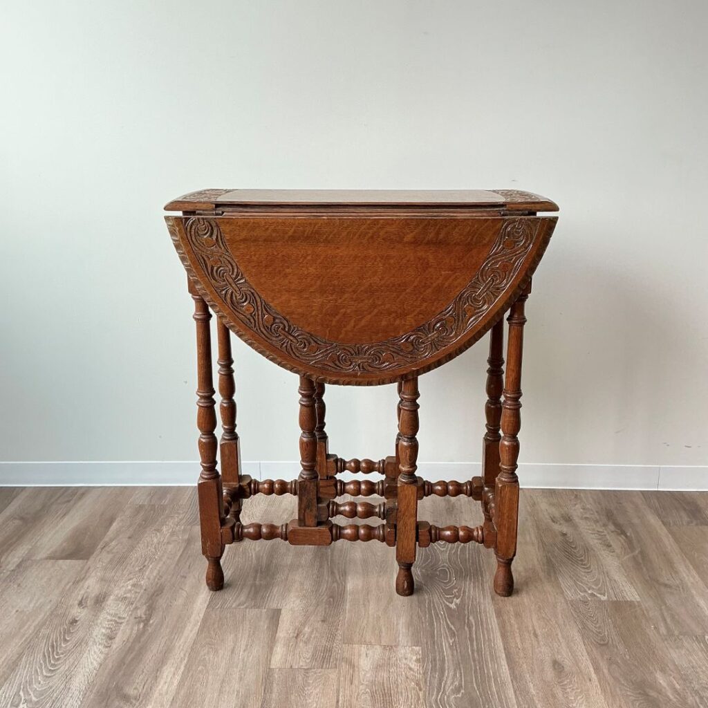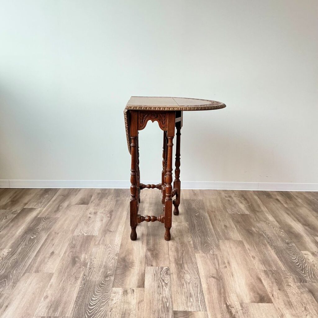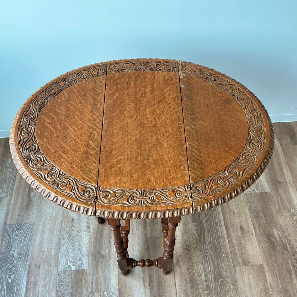 1920年代、オーク材のゲートレッグテーブル。天板縁の彫刻が特徴的です。