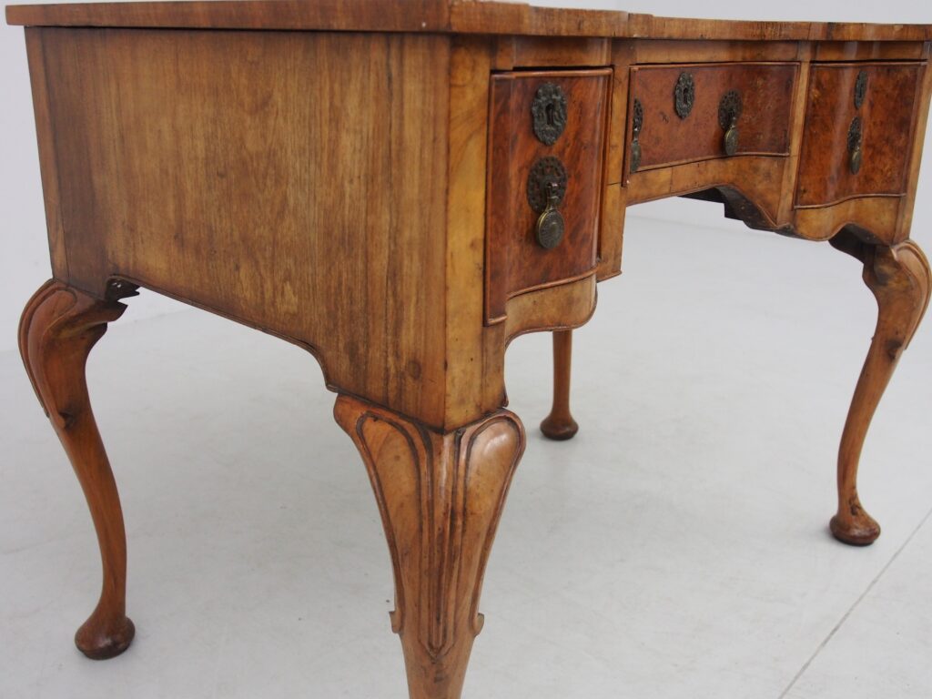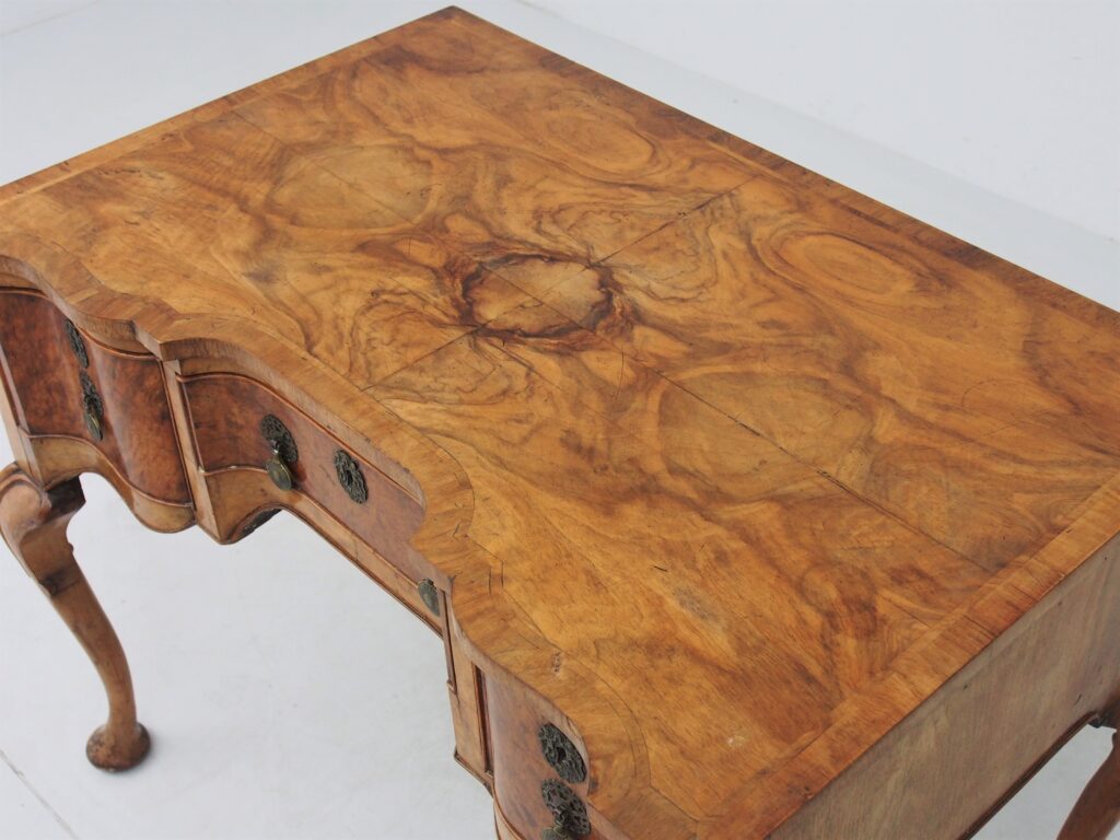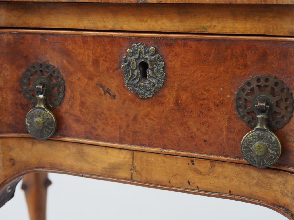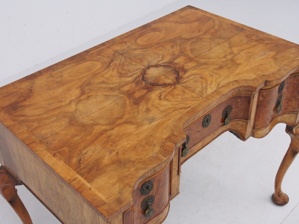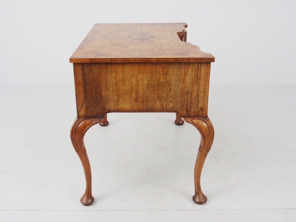 天板のウォルナットの扇文様の化粧張りが素敵なクイーンアンスタイルのデスクです。