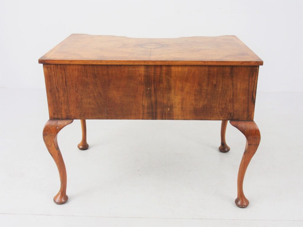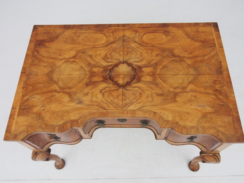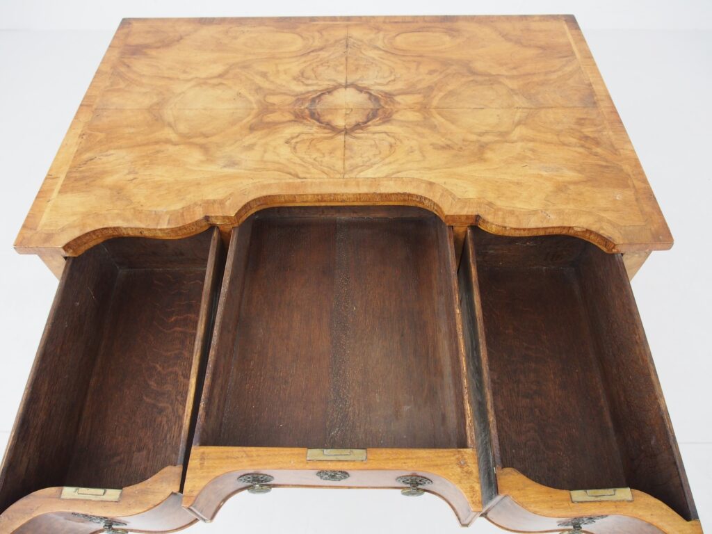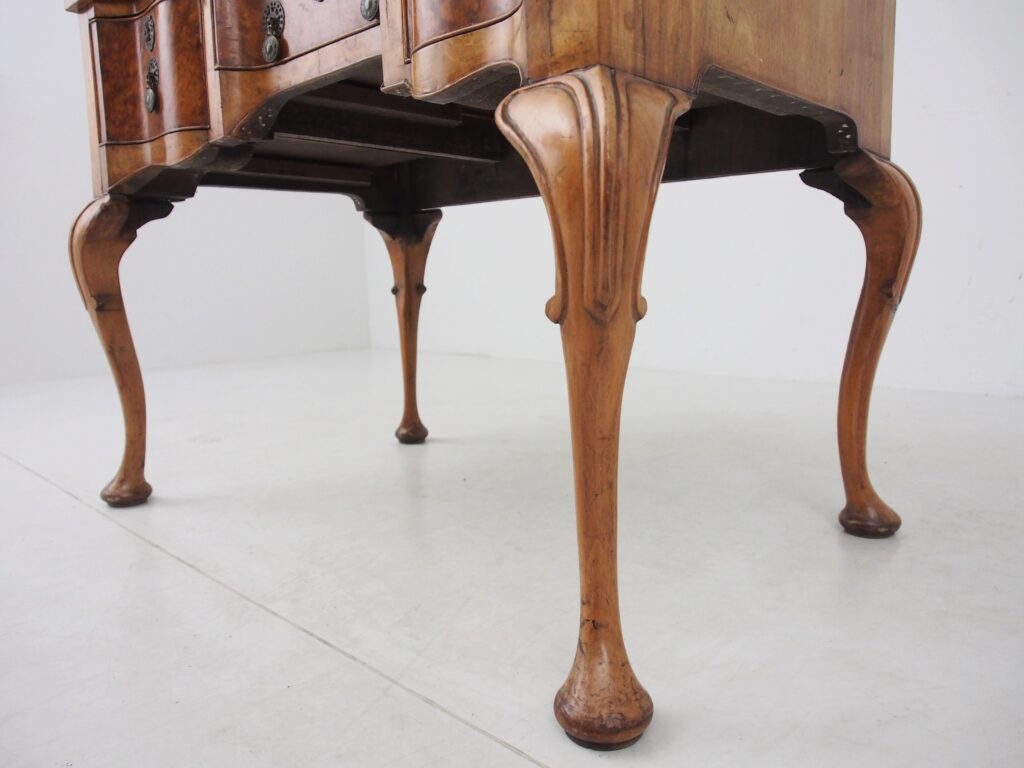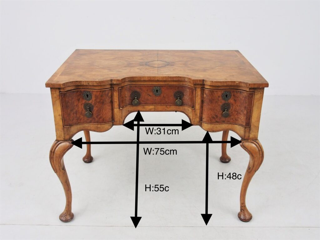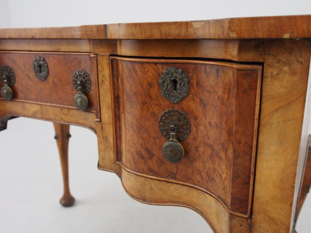 天板のウォルナットの扇文様の化粧張りが素敵なクイーンアンスタイルのデスクです。