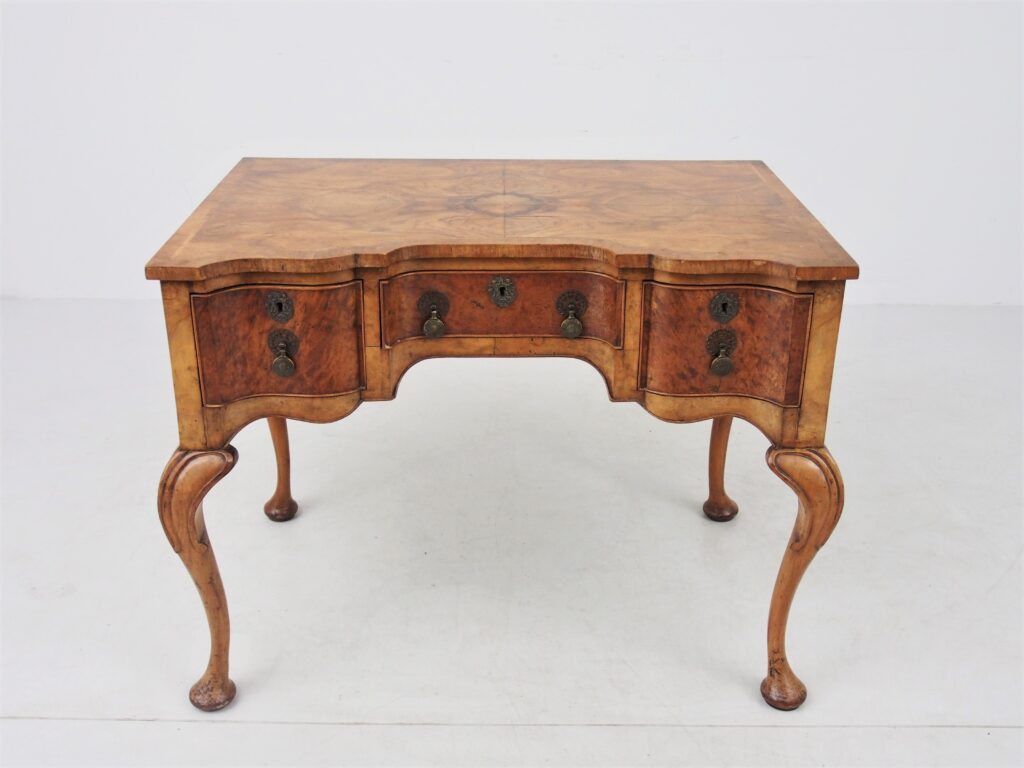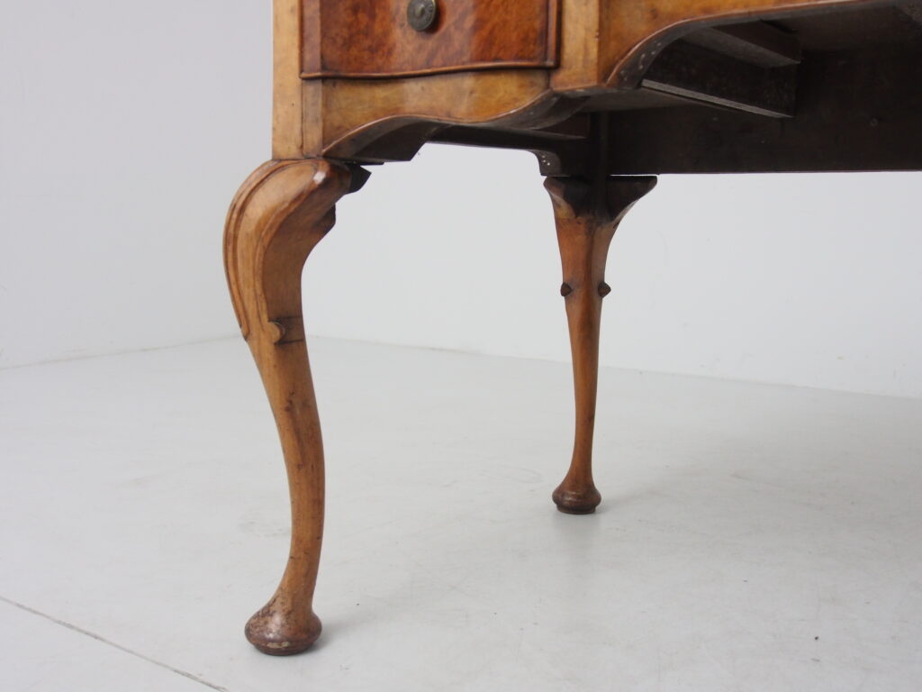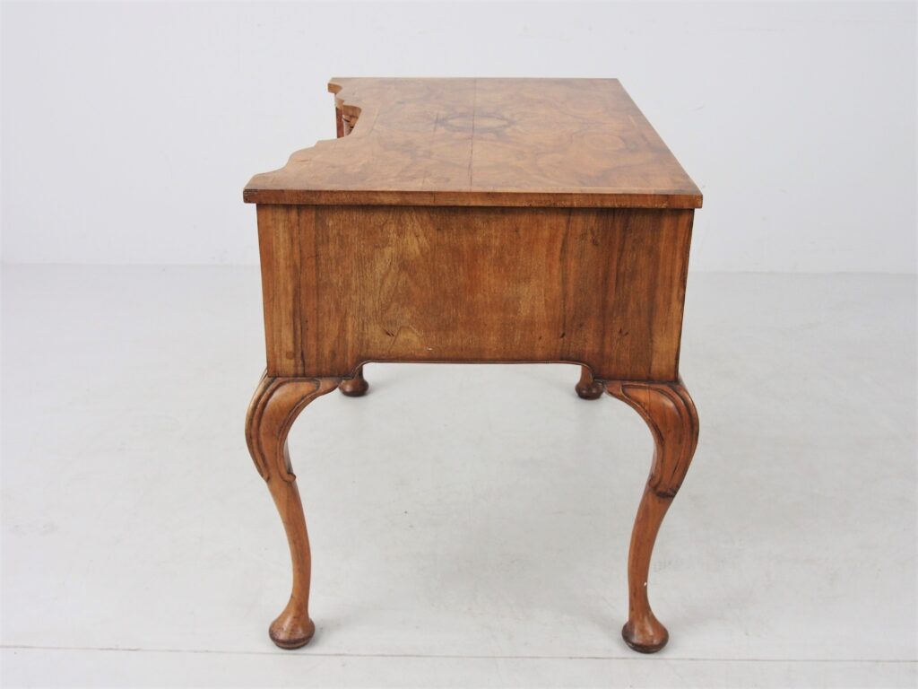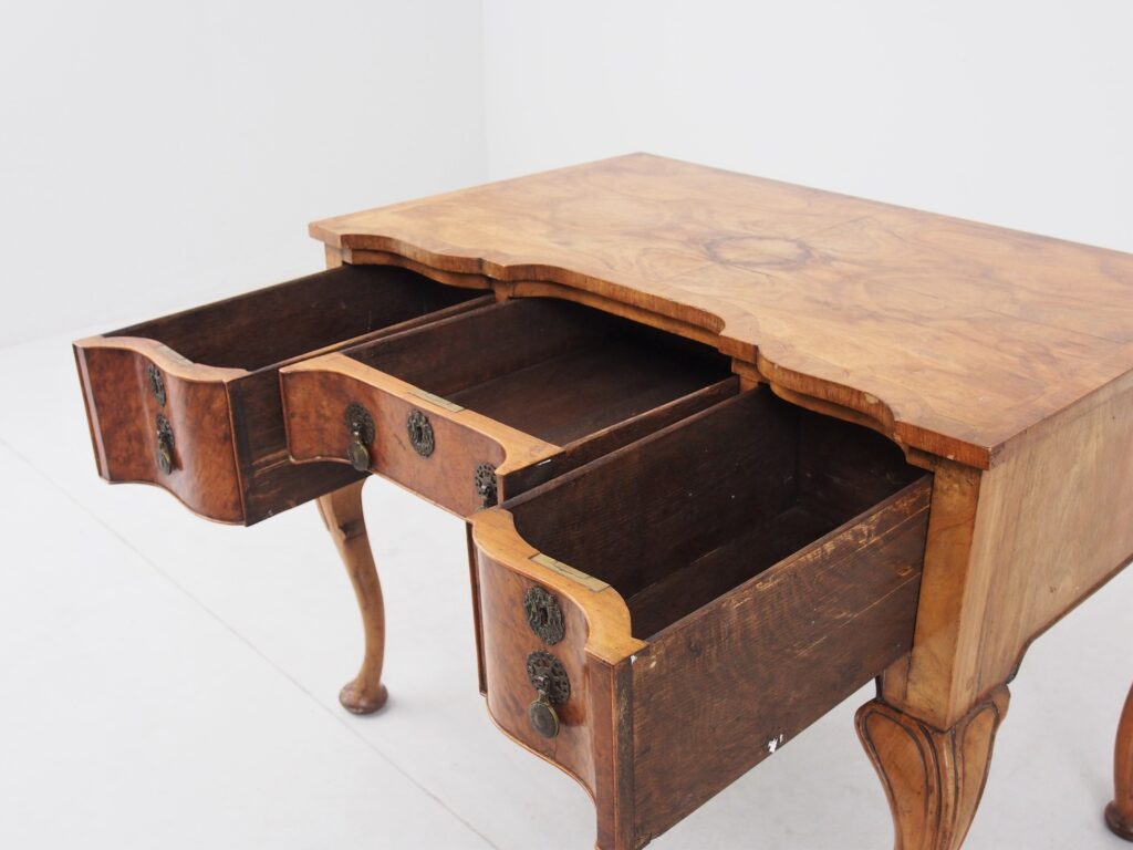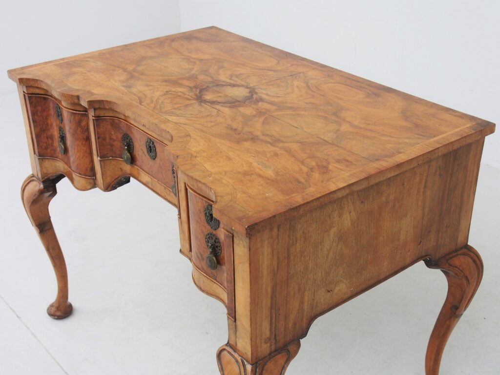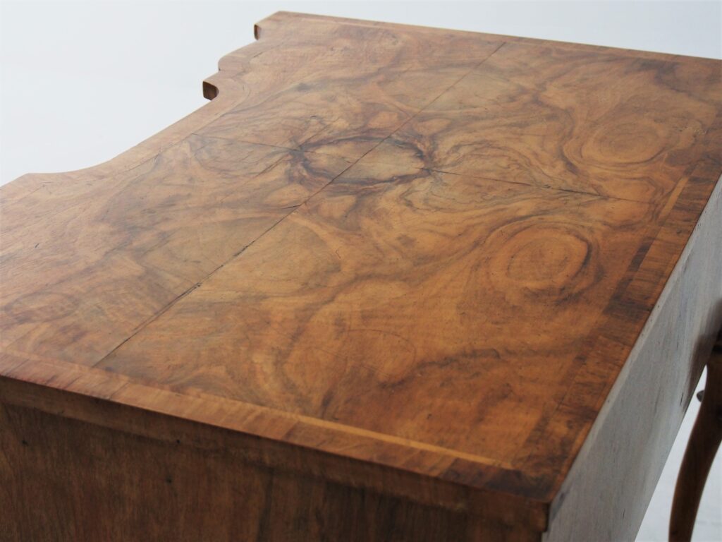 天板のウォルナットの扇文様の化粧張りが素敵なクイーンアンスタイルのデスクです。